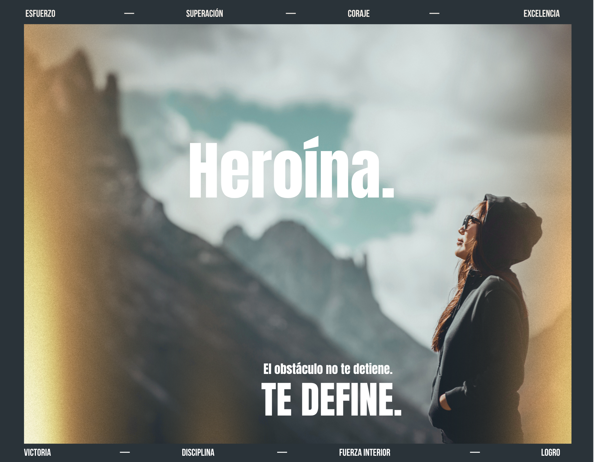 Tipografías limpias y directas, sin adornos que distraigan del mensaje. Paleta intensa y rotunda, o un minimalismo absoluto que deje que el mensaje grite por sí solo. Fotografía con fuerza: planos cortos cargados de intensidad, imágenes que sugieren superación y esfuerzo. Nada idealizado — la realidad cruda comunica más que la imagen perfecta.